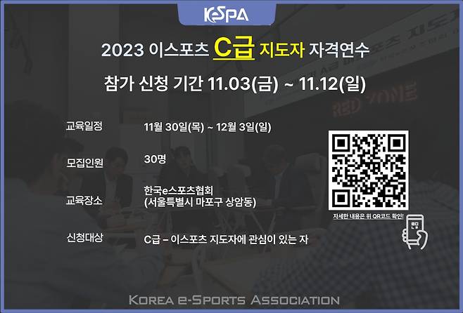 11월 30일(목)부터 12월 3일(일)까지 진행되는 C급 이스포츠 지도자 자격연수는 협회가 주최, 주관하는 연수로서, 이스포츠 지도자 민간자격 제도 도입 이후 지난 6월에 진행된 A급 이스포츠 지도자 자격연수에 이어서 시행하는 첫 번째 C급 지도자 자격연수다.
