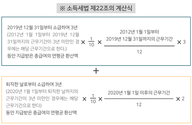 소득세법 제22조의 계산식에 따라 계산하면 되지만 근무 기간에 따라 적용되는 배수가 달라, 많은 법인이 계산에 다소 어려움을 겪고 있습니다.