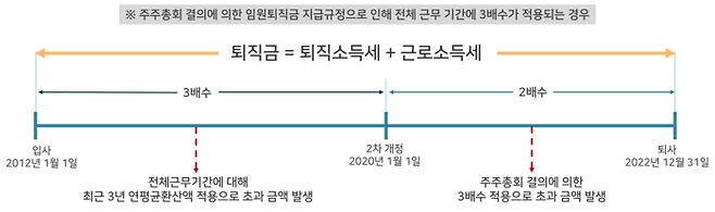 임원이 3배수와 2배수 적용 기간에 모두 근무한 경우는 소득세법 규정에 따라 연도에 맞게 적용하면 됩니다. 이때 주주총회 결의에 의한 임원 퇴직금 지급 규정으로 인해 전체 근무 기간에 3배수가 적용되는 경우를 유의해야 합니다.