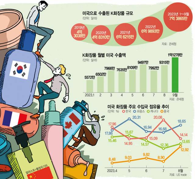 한국 화장품의 현지 시장 영향력 제고는 미국 정부 통계에서도 확인할 수 있다. 3일 미국 국제무역위원회(ITC)와 USA 무역통계 등에 따르면 올 7월 미국 화장품 수입국 중 한국이 점유율 20.1%로 1위를 차지했다. 앞서 지난해 5월과 올 4월에도 각각 점유율 17.0%, 18.0%로 1위에 올랐지만 20%를 넘긴 것은 7월이 처음이었다. 프랑스·캐나다 등과 점유율 경쟁을 벌이면서 점점 우상향하는 모습이다.