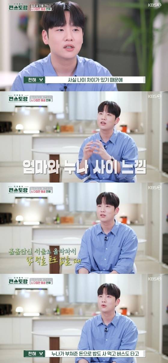 이날 한해는 7살 차이의 친누나를 집에 초대했다. 나이 차이가 크게 나다 보니 엄마와 누나의 중간 관계라고. 한해는 "제가 정말 경제난, 당장 밥 먹을 돈도 없을 때 누나가 부쳐준 돈으로 밥도 사 먹고, 버스도 탔다"며 무작정 서울로 올라왔을 당시 따뜻한 조력자였다고 밝혔다.