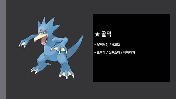 서포터는 날씨부정을 지녀 쾌청무시와 '싫은소리'로 방어 랭크를 하락시킬 수 있는 '골덕'을 추천한다. 물 단일 타입으로 히스이 블레이범에게 약점을 찔리지 않고, 비바라기도 사용할 수 있다.