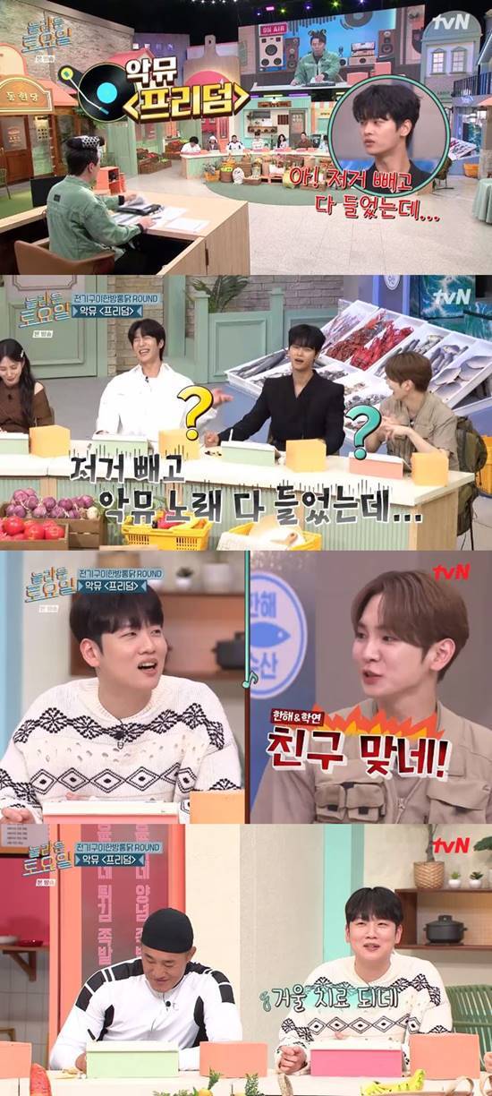 '놀토' 멤버들이 모두 웃자, 차학연은 "진짜다"라며 억울한 듯한 반응을 보였고, 키는 "친구 맞네, 친구 맞아"라며 항상 말을 번복하는 한해의 모습이 차학연에게 보인다고 말했다. 이어 한해는 "너도 진짜 지긋지긋하다. 거울 치료 된다"라며 장난스레 말했다.