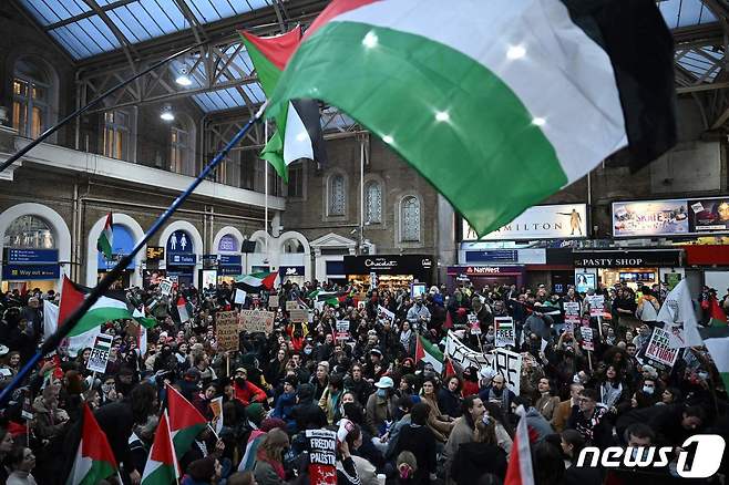 (런던 AFP=뉴스1) 최종일 기자 = 영국 런던 시내에 위치한 기차역 채링크로스역 내부에서 4일(현지시간) 이스라엘-하마스 간 휴전을 촉구하는 시위가 벌어졌다.