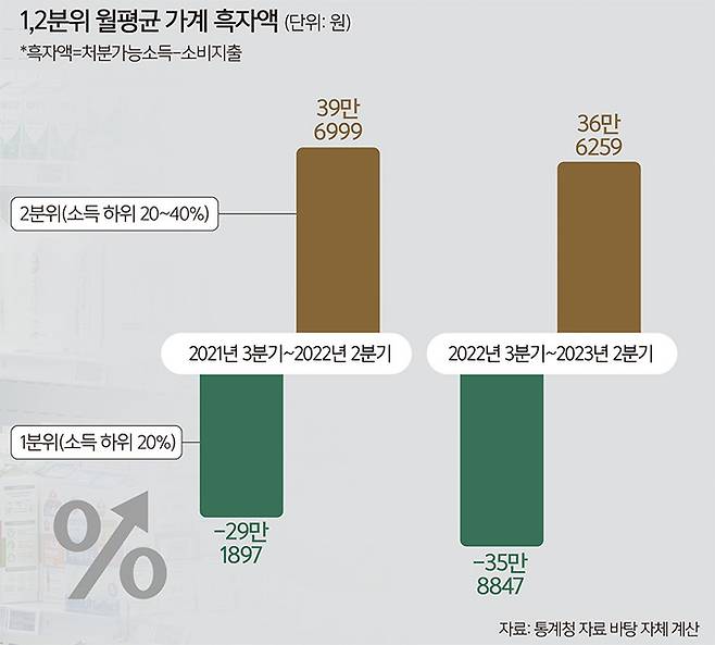 처분가능소득보다 필수생계비가 더 크게 증가하면서 저소득층 가계 사정도 눈에 띄게 악화하고 있다. 가계수지 추이를 보면 최근 1년(2022년 3분기~올해 2분기) 1분위의 흑자액은 월평균 -35만8847원을 기록했다. 흑자액은 처분가능소득에서 필수생계비를 포함한 각종 소비지출을 제외한 개념이다. 이는 직전 1년(2021년 3분기~2022년 2분기) 평균 흑자액인 -29만1897원보다 6만6950원 악화한 것이다.