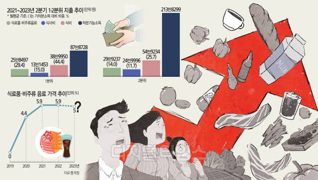 이처럼 먹거리 물가가 큰 폭으로 오르면서 저소득층이 직격탄을 맞았다. 지난 2분기 기준 소득 1분위(하위 20%) 가구의 월평균 처분가능소득은 94만 7000원으로 나타났다. 이들 가구는 식료품·비주류음료에 매달 24만원을 지출했고, 음식서비스(식사비)로는 12만 2000원을 썼다. 가처분소득의 37.4%를 식비로 지출한 셈이다. 처분가능소득 대비 식비 비중은 △소득 2분위 24.9% △3분위 22.7% △4분위 20.6% △5분위 15.6% 순으로 소득이 낮을수록 높게 나타났다.