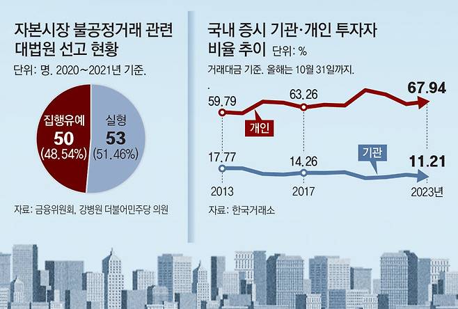 현행 자본시장법에 따르면 불공정거래로 인한 이득이 5억 원 이상 50억 원 미만이면 3년 이상의 유기징역, 50억 원 이상일 경우 무기징역을 내릴 수 있다. 하지만 부당이득 액수 산정 기준이 불명확하고, 주가를 움직이는 변수가 많아 중형이 선고되기 어려운 구조다. 게다가 법원 판결의 지침이 되는 대법원 양형기준을 보면 증권 범죄의 경우 가중처벌을 해도 최대 징역 15년까지만 선고할 수 있다. 2020∼2021년 대법원이 불공정거래 사건에서 실형을 선고한 비율은 51.46%에 불과하다. 피고인의 절반 가까이는 실형을 면한 것이다.