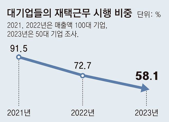 대기업들의 재택근무 시행 비중은 이미 꾸준히 줄고 있다. 한국경영자총협회 조사에 따르면 올해 9월 기준 국내 매출액 기준 50대 기업의 58.1%가 재택근무를 시행 중이다. 매출액 100대 기업을 대상으로 조사했던 2021년, 2022년에 이 비중은 각각 91.5%, 72.7%였다. 매년 빠르게 감소하고 있는 것이다.