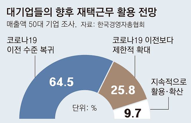 다른 대기업들 중에서도 3곳 중 2곳이 재택근무 활용 전망에 대해 코로나19 이전 수준으로 돌아갈 것으로 내다봤다.
