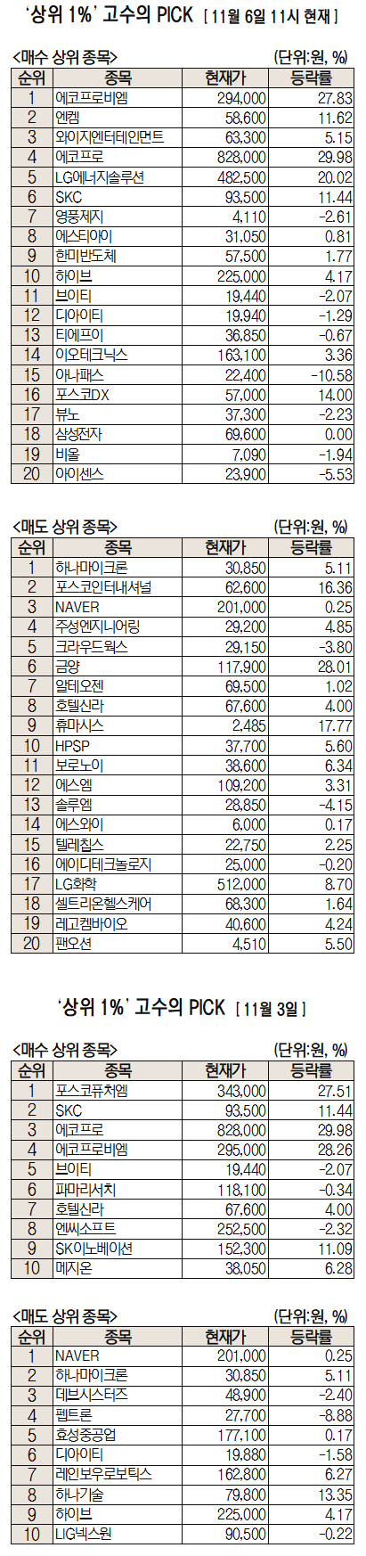 이날 미래에셋엠클럽에 따르면 미래에셋증권 주식 거래 고객 중 최근 1개월 간 투자수익률 상위 1%에 해당하는 ‘주식 초고수’들이 오전 11시까지 가장 많이 사들인 종목은 에코프로비엠으로 집계됐다.
