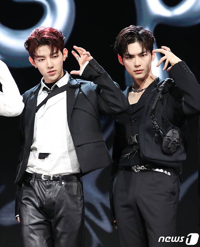 (서울=뉴스1) 권현진 기자 = 그룹 제로베이스원(ZEROBASEONE)의 장하오와 성한빈(오른쪽)이 6일 서울 광진구 예스24라이브홀에서 가진 두 번째 미니 앨범 '멜팅 포인트(MELTING POINT)' 발매 쇼케이스에서 포즈를 취하고 있다. 2023.11.6/뉴스1