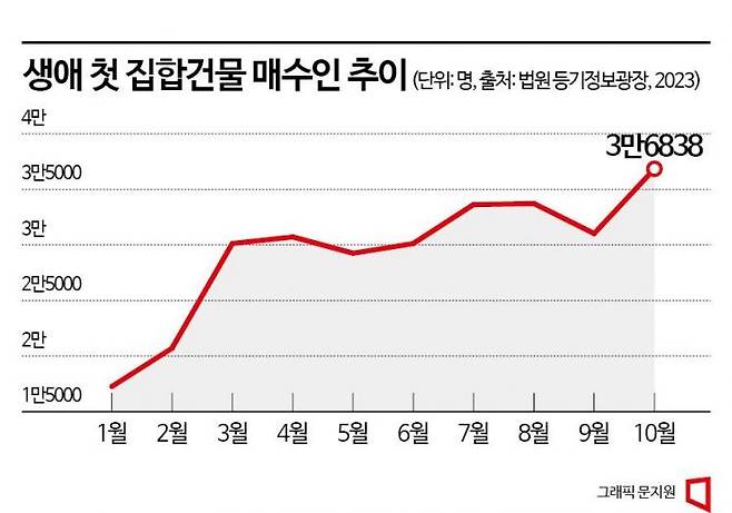 6일 법원 등기정보광장 ‘소유권 이전등기(매매) 신청자 현황'에 따르면 10월 집합건물 생애 최초 매수자는 3만6838명으로 집계됐다. 전월 3만1019명 대비 5819명(18.8%) 증가한 수치로, 올해 중 가장 많았다. 1년 전(1만7087명)과 비교하면 2배 이상으로 늘었다.
