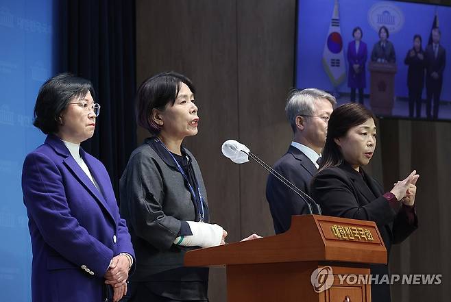 (서울=연합뉴스) 신준희 기자 = 최민희 방송통신위원회 상임위원 후보자가 7일 국회에서 기자회견을 열고 후보자 사퇴를 발표하고 있다. 왼쪽은 김현 전 방통위 상임위원. 2023.11.7