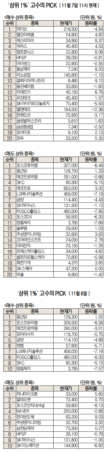 미래에셋증권에서 거래하는 고수익 투자자들이 7일 오전 가장 많이 순매수한 종목은 하이브(352820)으로 나타났다. 엘오티베큠(083310), 에스티아이(039440), 메디톡스(086900), 제우스(079370) 등도 이름을 올렸다.