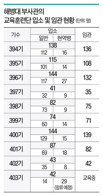 하지만 입소한 후보생이 전부 임관하는 것도 아니다. 해병대는 매년 다섯 기수로 나눠 해병대를 부사관을 뽑고 있다. 지난해 임관한 해병대 부사관(394~398기) 수는 486명인 반면, 올해(399~402기) 임관 부사관은 334명으로 줄었다. 403기 일반·현역병 후보생이 모두 임관한다고 가정해도 지난해보다 100명 이상 줄어든 376명에 그칠 전망이다.