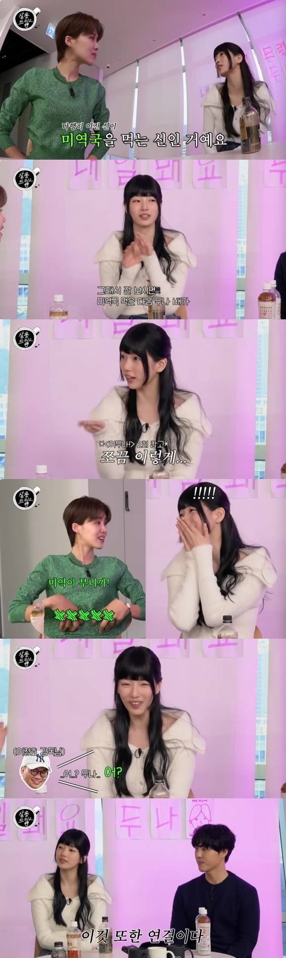 그러면서 "다행히 이전 신이 미역국을 먹는 신이었다. '아 이건 괜찮겠다'라고 생각했다. 잘 보면 미역국을 먹은 다음에 두나 배가 조금 (나왔다). 감독님이 '어? 두나 어?'라고 하셔서 전에 미역국을 많이 먹은 것이라고 얘기했다"라고 말해 웃음을 자아냈다.
