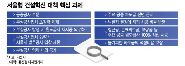 대책은 세부적으로 3개 부문·8가지 핵심과제로 나뉜다. 우선 '공공건설 분야'에서 부실공사 업체에 대해선 강력한 제재를 가한다. 부실로 인한 사고 발생 시 즉각 원도급사의 재시공을 의무화한다. 이와 관련해 시는 서울특별시 공사계약 특수조건에 '의무 재시공' 관련 내용을 추가하고 내년 상반기 개정 완료해 시행에 들어갈 예정이다. 또 부실공사 업체는 서울시에서 발주하는 턴키 등 대형공사 기술형 입찰의 참가가 2년간 제한된다.