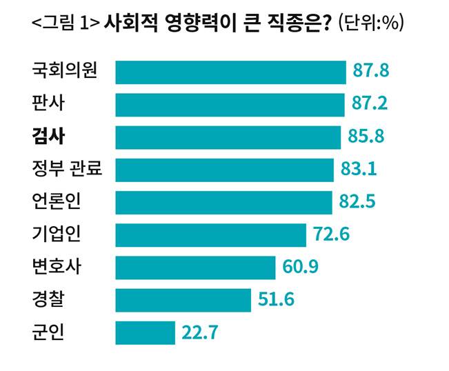 시작해보자. 우선 우리 사회 각 전문직 중 누가 사회적 영향력이 큰지 물었다(‘영향력이 매우 크다’+‘큰 편이다’ 합계). 국회의원(87.8%), 판사(87.2%), 검사(85.8%) 순이었다. 정부 관료(83.1%), 언론인(82.5%), 기업인(72.6%), 변호사(60.9%), 경찰(51.6%), 군인(22.7%)이 그 뒤를 이었다. 선출직인 국회의원을 제외하면 ‘판검사’가 우리 사회에서 가장 큰 영향력을 갖고 있다고 응답했다. 같은 법조인이지만 판검사와 변호사의 영향력 차이가 25%포인트나 벌어지는 것도 눈에 띈다(〈그림 1〉 참조).