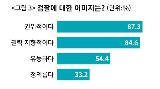 검찰에 관한 이미지 형성에 가장 큰 영향을 미친 요소에 대해서도 물었다. ‘검찰이 지휘했던 주요 수사 결과(24.7%)’ ‘검찰 출신 정치인의 언행(24.4%)’ ‘검찰 관련 뉴스(23.8%)’ 순으로 높았다. ‘대중문화 속 이미지(10.8%)’나 ‘주변 사람의 평가(6.0%)’ ‘사건에 연루돼 수사를 받아본 경험(2.6%)’은 높지 않았다. 상당수 시민은 검찰의 수사 결과나 언행, 관련 뉴스 같은 구체적 정보를 취합해 검찰에 대한 이미지를 형성했음을 알 수 있다.
