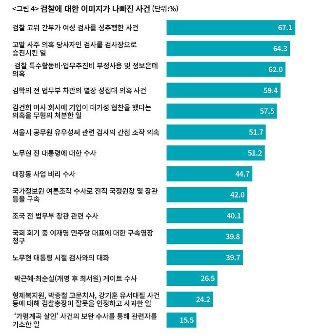 결과는 이렇다. 검찰 이미지가 나빠진 사건으로 응답자들은 ‘검찰 고위 간부가 여성 검사를 성추행한 사건’을 1위로 꼽았다(〈그림 4〉). 2018년 서지현 검사의 ‘미투’ 사건이다. 검찰 간부가 동료 검사를 성추행한 데 이어, 이로 인한 인사 불이익까지 당했다는 논란이 커지면서 우리 사회에 큰 충격을 줬다.