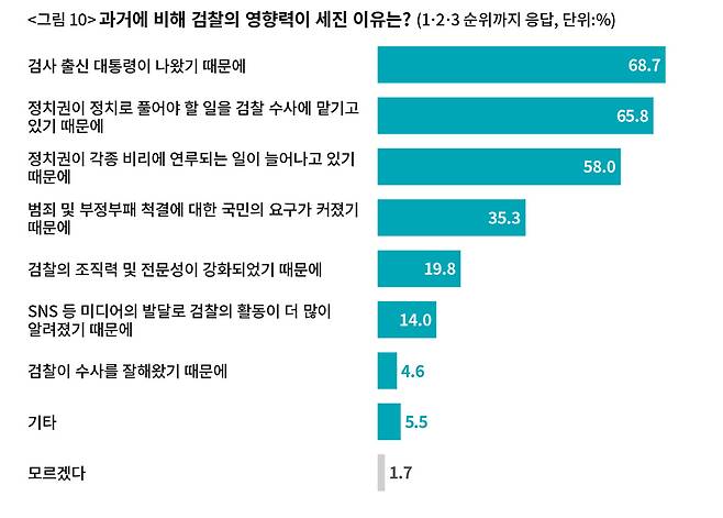 이 결과가 말하는 바는 이렇다. 검찰의 영향력이 커진 배경에는 ‘정치’가 있다. 검찰이 정치에 직간접으로 영향력을 행사하는 일들이 잦아지면서 검찰의 힘 자체가 커졌다. 영향력이 커진 이유에 대해 3순위까지 응답한 결과를 보면 이는 더욱 뚜렷해진다(〈그림 10〉). 정치로 풀어야 할 일을 검찰 수사에 맡기기 때문이라는 응답과 정치권이 비리에 연루되는 일이 늘고 있기 때문이라는 응답이 큰 폭으로 오른다. 거꾸로 말하자면, 검찰의 힘을 다스릴 수 있는 존재가 결국 정치라는 이야기다.