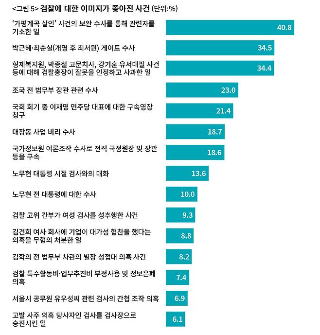 이미지가 좋아진 사건으로는 ‘가평계곡 살인사건의 보완 수사’가 1위로 꼽혔다(〈그림 5〉). 이어서 ‘박근혜·최순실 게이트 수사’ ‘검찰총장의 과거사 사과’가 꼽혔다. 눈여겨볼 점은 이들 사건이 검찰이 이뤄낸 ‘성과’임에도, 이미지가 ‘좋아졌다’고 응답한 비율이 높지 않다는 점이다. 가평계곡 사건의 경우 40.8%만 좋아졌다고 응답했고, 박근혜·최순실 게이트는 34.5%, 과거사 사과도 34.4%에 머물렀다. 상당수가 검찰 이미지가 ‘특별히 변하지 않았다’고 응답했기 때문이다. 이미지가 나빠진 사건의 경우 1, 2, 3위 모두 60% 이상 응답한 것과 대비된다.