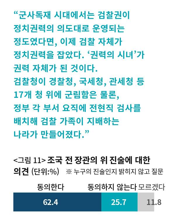 윤석열 정부와 검사 집단을 이보다 더 강도 높게 비판한 것을 찾기 어려울 것이다. 이에 대해 62.4%가 ‘동의한다’고 답했다. 진보층의 86.5%, 중도층의 59.9%, 보수층의 46.0%가 동의했다. ‘동의하지 않는다’는 25.7%, ‘모르겠다’는 11.8%였다(〈그림 11〉).