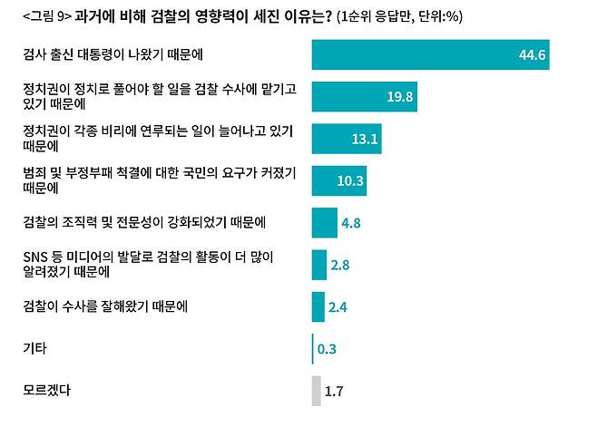 여기서 다시, 검찰의 영향력이 커졌다고 생각하는 응답자 576명에게만 따로 그 이유를 물었다(1순위 응답). ‘검사 출신 대통령이 나왔기 때문’이라는 응답이 44.6%로 가장 많았다. 다음으로 ‘정치권이 정치로 풀어야 할 일을 검찰 수사에 맡기고 있기 때문(19.8%)’ ‘정치권이 각종 비리에 연루되는 일이 늘어나고 있기 때문(13.1%)’ 순이었다. ‘범죄 및 부정부패 척결에 대한 국민의 요구가 커졌기 때문(10.3%)’이나 ‘검찰이 수사를 잘해왔기 때문(2.4%)’ 등의 응답은 많지 않았다(〈그림 9〉).
