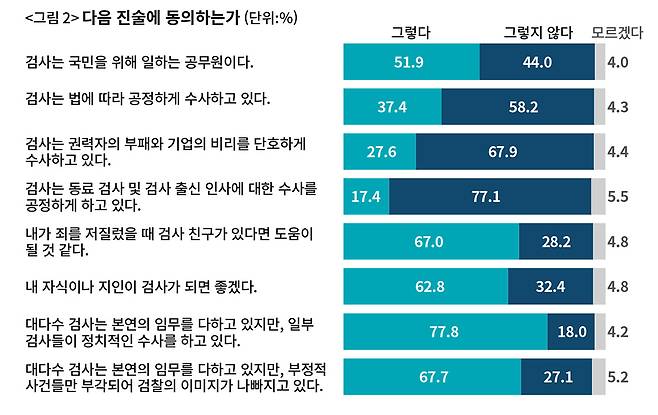 이제 본격적인 질문이다(〈그림 2〉). 맨 처음 질문은 ‘검사는 국민을 위해 일하는 공무원이다’라는 진술에 대한 동의 여부다. ‘그렇다(매우 그렇다+그런 편이다)’가 51.9%로 절반을 넘겼지만, ‘그렇지 않다(전혀 그렇지 않다+그렇지 않은 편이다)’도 44.0%로 나타났다. 이 질문은 사실 ‘워밍업’에 가까운 것이었다. 그럼에도 검사는 국민의 ‘공복’이 아니라고 여기는 응답이 적잖게 나왔다.