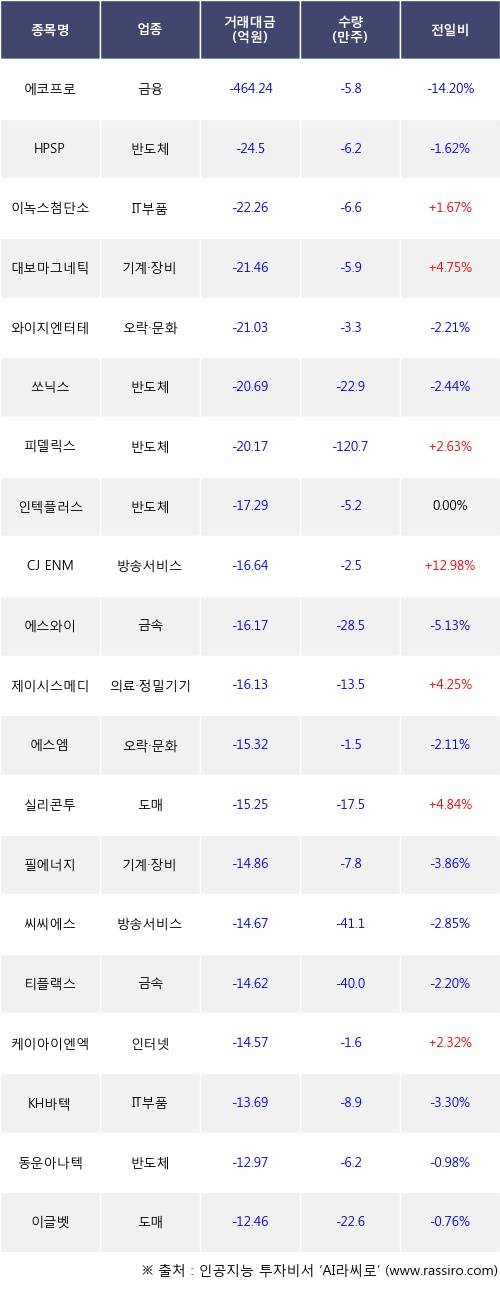외국인 투자자의 순매도 상위 20개 종목은 에코프로, HPSP, 이녹스첨단소재, 대보마그네틱, 와이지엔터테인먼트, 쏘닉스, 피델릭스, 인텍플러스, CJ ENM, 에스와이등이다.