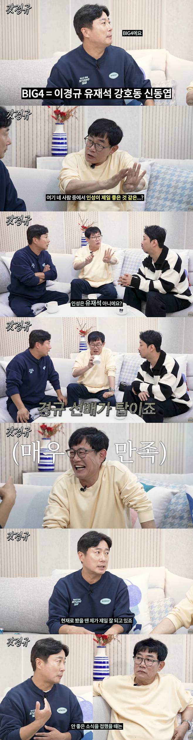그러자 이수근은 "인성은 유재석 선배 아니냐. 인성은 유재석 선배인 거 같다"며 "애드리브와 진행 능력, 센스 등은 나이 종합해서 다 봤을 때 이경규 선배가 톱이다"라고 말했다. 그는 "기본적으로 외모가 된다. 잘생긴 개그맨의 계보 아니냐"며 이경규를 치켜세웠다. 이를 들은 이경규는 흐뭇한 표정을 지으며 크게 웃었다.