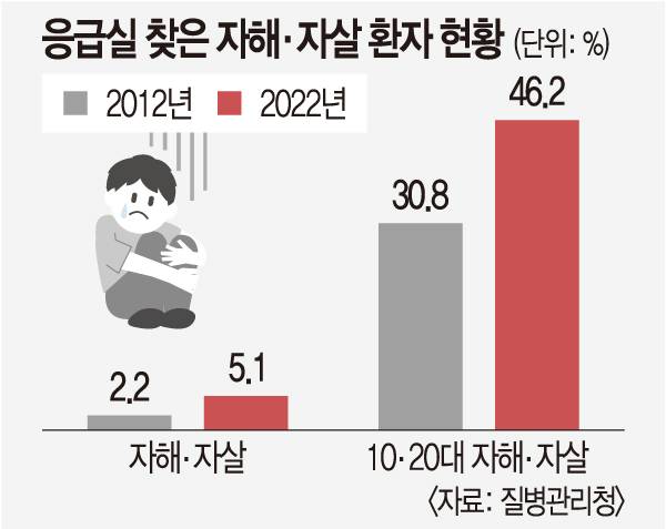A군처럼 학업·교우 스트레스를 일시적으로 해소하기 위해 자해·자살 시도를 하는 10대가 크게 늘고 있다. 8일 질병관리청이 응급실에 내원한 환자를 대상으로 분석한 ‘2022 손상유형 및 원인 통계’를 보면 사고가 아닌 자해·자살로 내원한 경우는 2012년 2.2%에서 지난해 5.1%로 증가했다. 전체 비율도 늘었지만 이 가운데 10·20대 비율이 같은 기간 30.8%에서 46.2%로 10년 사이 15.4%포인트나 증가했다.