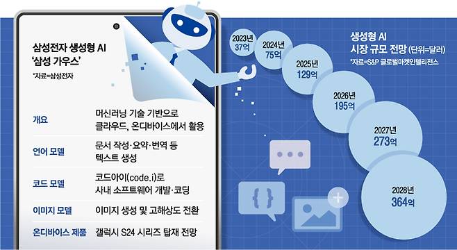 글로벌 IT 공룡들이 앞다투어 생성형 AI에 뛰어드는 이유는 시장의 폭발적 성장이 예고되기 때문이다. S&P 마켓인텔리전스에 따르면, 올해 생성형 AI 시장은 37억달러(약 4조8400억원)에 그쳤지만 2028년에는 364억달러(약 47조6400억원)로 커질 전망이다. 5년 만에 시장 규모가 10배 가까이 성장할 수 있다는 의미다.