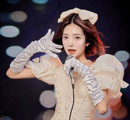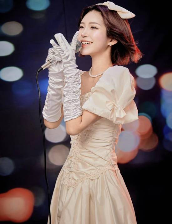 공주풍 드레스를 입고 마이크를 든 채 싱그러운 미소를 짓는 최준희는 완벽한 가수의 모습을 하고 있다.