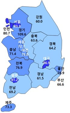 수도권은 103.7에서 80.1로 내리며 기준선을 밑돌게 됐고, 광역시(97.2→76.5)와 도 지역(84.6→67.5) 또한 동반 하락했다. 특히 대전(106.6→75.0)과 세종(108.3→72.7)은 각각 30포인트 이상 급락했다.