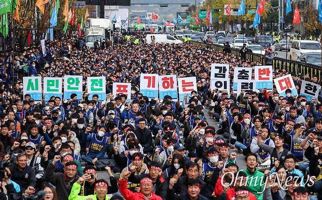 [오마이포토] 시한부 경고파업 돌입한 서울교통공사노조 총파업 출정식