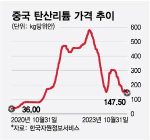 중국 탄산리튬 가격은 연초 대비 3분의 1수준으로 하락했다.