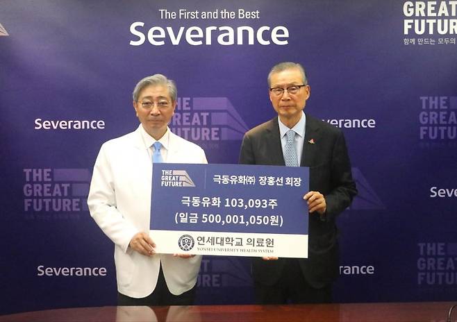 극동유화그룹은 장홍선 회장(오른쪽)이 연세의료원에 5억원 상당의 극동유화 주식 10만 주를 기증했다고 9일 밝혔다. 기증된 주식은 사회 취약 계층의 의료비 지원 및 연세의료원 의료 서비스 발전에 사용될 전망이다.