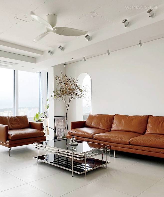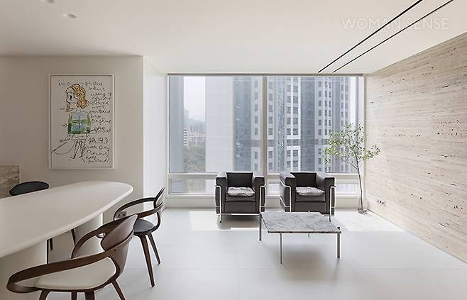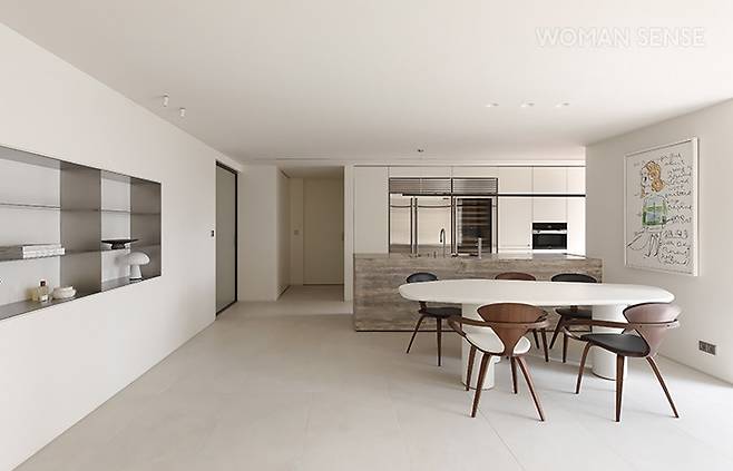 아일랜드 앞으로 식사를 할 수 있는 식탁을 배치해 주방과 연결된 느낌을 주고, 벽면엔 수납공간을 만들었다. 큰 소파 대신 1인 소파를 2개 나란히 배치한 것이 특징. 빈 벽에 질감이 느껴지는 마감재를 사용해 따스한 무드를 더했다. -@817designspace_director