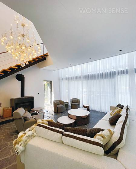 넓은 거실 전체에 소파와 1인 체어를 둘러놓아 아늑함이 가득하다. TV가 있을 자리에 실제 사용이 가능한 벽난로를 두어 겨울엔 난방 효과까지 더한다. -@noh_jinseon