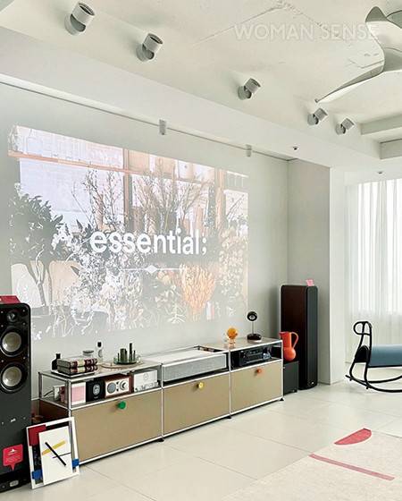 벽면에 나지막한 가구와 스피커 등 음향 기기를 두어 TV가 없는 것만 제외하면 익숙한 분위기. 미관상 덩치 큰 텔레비전을 두는 게 싫어 빔 프로젝트로 음악과 영상을 즐긴다. 소파의 배치를 바꿔 변화를 주기도. -@b__haus.ella