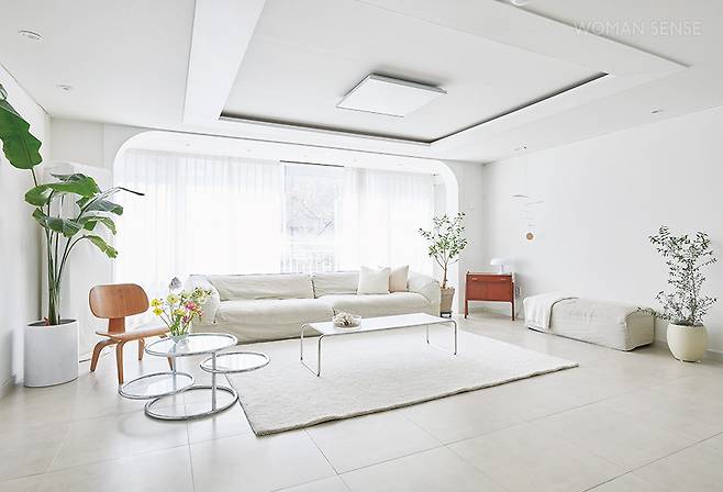 확장한 거실 쪽에 소파를 등지도록 놓아 아늑한 분위기를 완성했다. 벽을 비워 단조로울 수 있는 느낌은 소가구, 모빌, 식물들로 채웠다. -@gong_chee_u