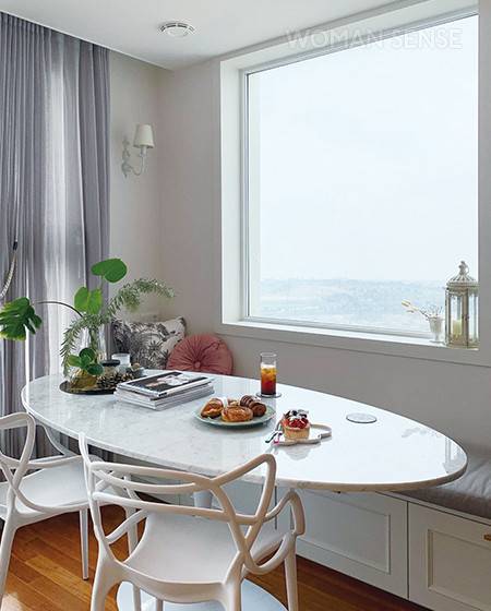 리빙, 다이닝, 키친으로 공간을 구분하면서 아이와 함께하는 시간에 생활 동선이 나뉘지 않도록 과감하게 TV를 없앴다. 모듈 소파를 자유자재로 배치해 다양하게 변화를 주는 이벤트 공간이 됐다. 소파 반대편 통창이 있는 자리는 벤치를 놓아 서브 다이닝 공간으로 꾸몄는데, 액자 같은 뷰를 들이기 위해 환기창을 고정 창으로 교체했다. -@maris_jini
