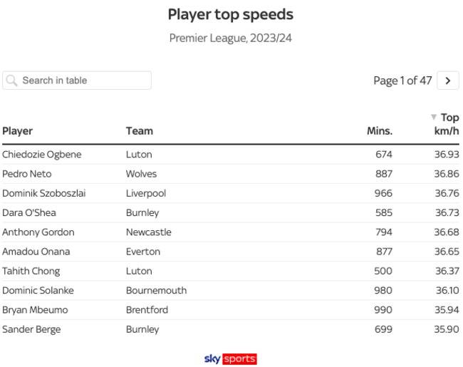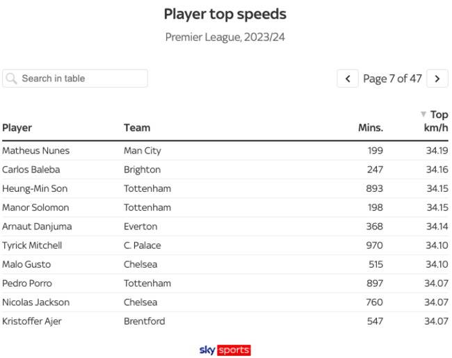 손흥민의 가장 빠른 속력은 34.15km/h였다. 이는 PL 전체 선수 가운데 총 63위에 해당하는 수치였다. 가장 빠른 속력을 기록한 선수는 치에도지 오그베네(루턴 타운)로 36.93km/h를 기록했다. 그 뒤를 이어 페드로 네투(울버햄튼)가 36.86km/h, 도미니크 소보슬러이(리버풀)가 36.76km/h의 속력을 나타냈다. 토트넘 선수 가운데 가장 빠른 선수는 미키 판 더 펜으로 35.52km/h를 기록했다.