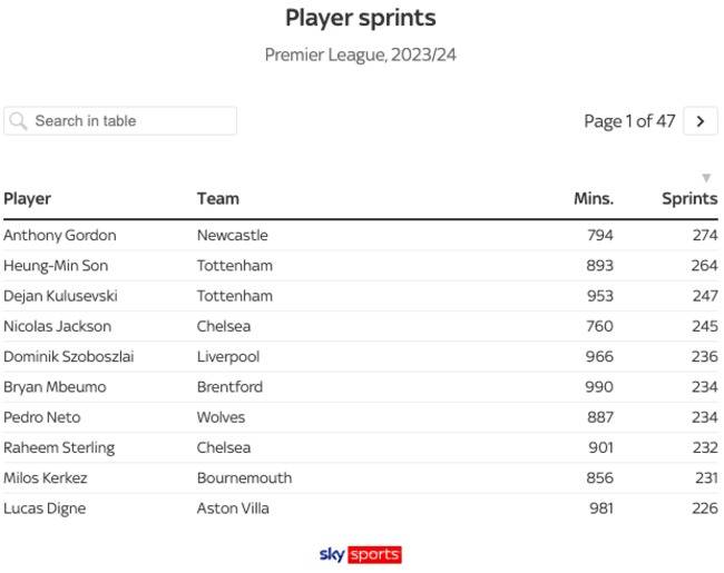 그 중심엔 손흥민이 있었다. 손흥민은 전체 선수 가운데 스프린트 횟수 2위에 이름을 올렸다. 손흥민은 총 264회의 스프린트를 기록했다. 앤서니 고든(뉴캐슬 유나이티드)이 274회로 1위를 차지했고, 손흥민에 이어 데얀 쿨루셉스키(247회)가 3위를 차지했다. 그만큼 토트넘은 전방에서부터 강한 압박과 빠른 속도를 활용한 공격을 펼친다는 것을 알 수 있다.