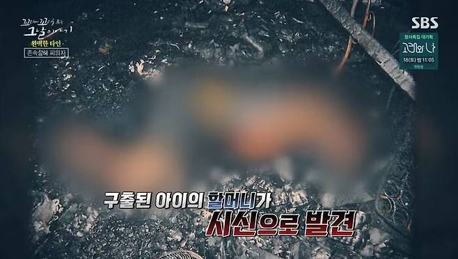 현장에 도착한 소방대원들은 겨우 불을 진압하고 집 안으로 들어갔어. 그런데 안방에서 시신을 발견했어. 먼저 구출된 아이 엄마의 친어머니야. 불에 완전히 탄 상태야.
