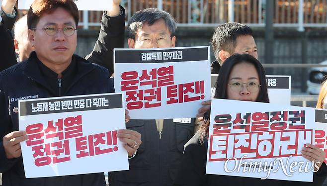 그러면서 '언론장악 집시법 개악' '전쟁위기 평화파괴' '노동자·농민·빈민·민중 다 죽이는 윤석열 정권' 등이 적힌 손팻말과 '전국에서 울려퍼진 윤석열 정권 퇴진 함성으로 11월 11일 퇴진광장을 열어내자'라고 적힌 펼침막을 들고 "용산의 검찰 독재정치를 끝장내자"라고 외쳤다.