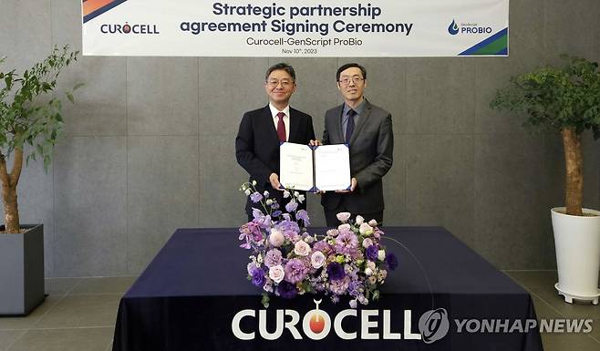 (서울=연합뉴스) 면역세포치료제 전문 기업 큐로셀이 10일 위탁개발생산기업(CDMO) 진스크립트프로바이오와 차세대 카티(CAR-T·키메라 항원 수용체 T세포) 치료제 개발을 위한 전략적 파트너십(MOU)을 체결했다고 밝혔다. 사진은 김건수 큐로셀 대표이사(왼쪽)와 패트릭 리우 진스크립트프로바이오 대표이사가 기념 촬영하는 모습. 2023.11.10 [큐로셀 제공. 재판매 및 DB 금지]