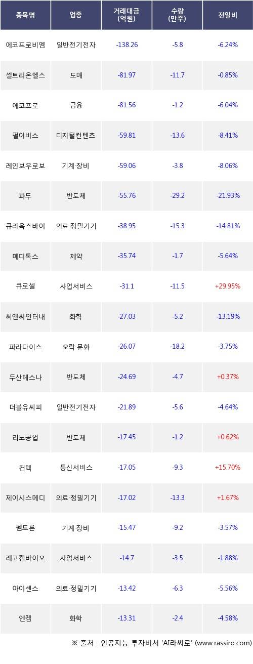 기관 투자자의 순매도 상위 20개 종목은 에코프로비엠, 셀트리온헬스케어, 에코프로, 펄어비스, 레인보우로보틱스, 파두, 큐리옥스바이오시스템즈, 메디톡스, 큐로셀, 씨앤씨인터내셔널등이다.