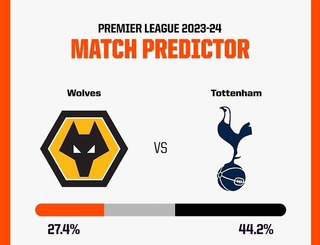 옵타는 "옵타의 슈퍼컴퓨터는 토트넘이 프리미어리그 시즌 첫 패배에 대한 반격을 시도하며 울버햄프턴(27.4%)을 상대로 승리할 확률이 44.2%라고 예측했다"라며 울버햄프턴과 토트넘의 승리 확률이 각각 27.4%, 44.2%로 토트넘이 우세하다고 전했다.